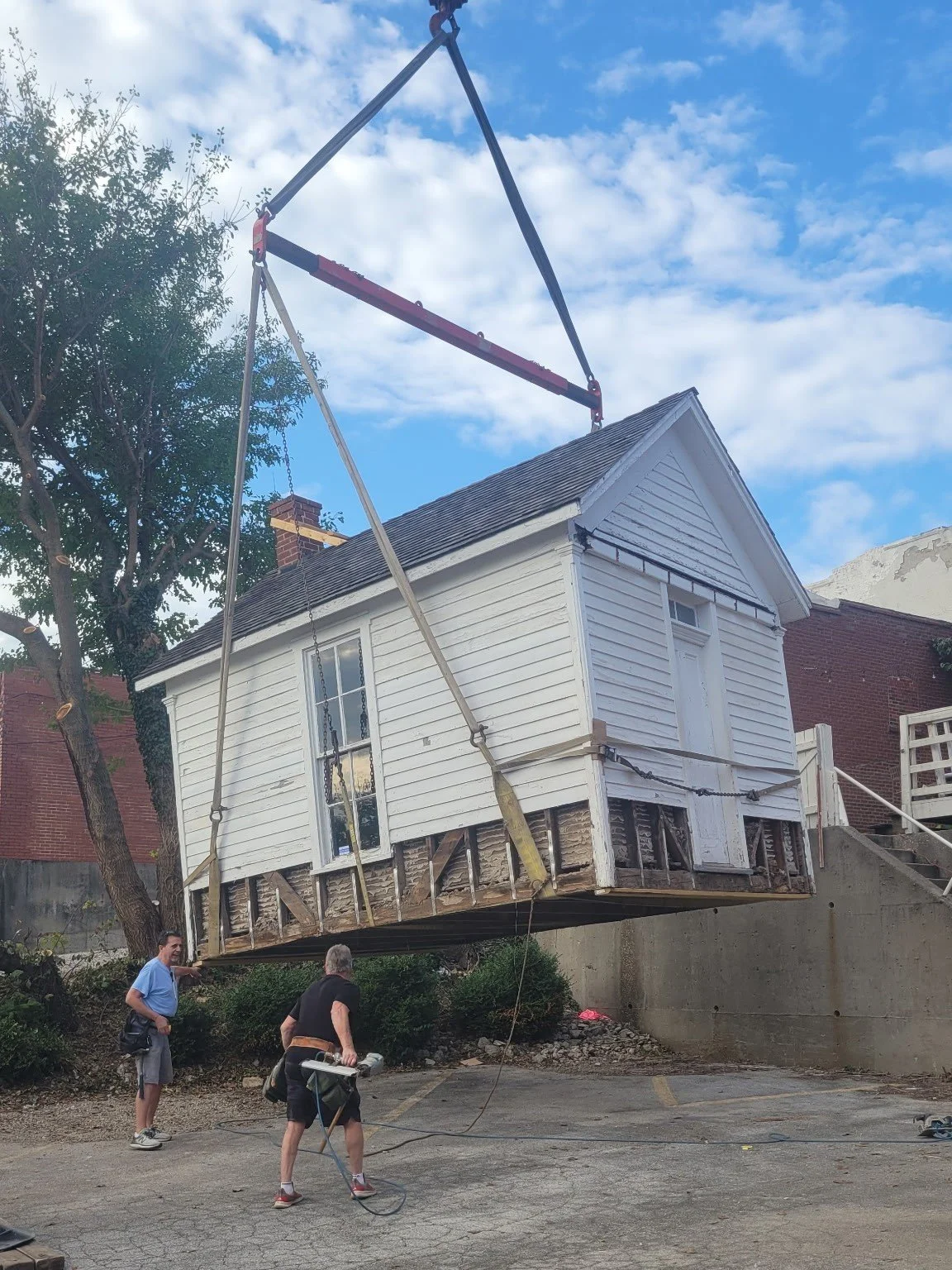 The first step of the process, the foundation work, began in early October. The schoolhouse was lifted off its foundation and placed in the lot behind the 1859 Jail Museum.
